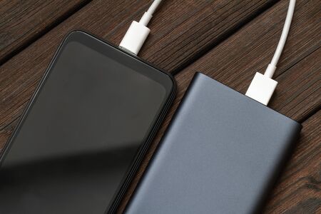 Smartphone is charging with backup battery or white power bank on the desk wooden table