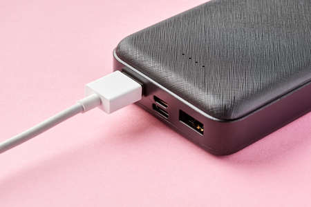 USB connector is connected to Power bank on a pink background. Charging gadgets. Close-up, selective focus
