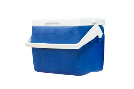 A blue cool box with a white holder isolated on a white background