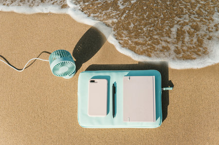 Notebook with smartphone on sandy beach