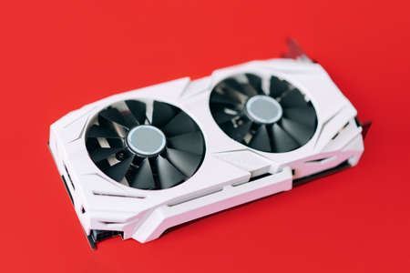 White graphics card with two black fans is located in the middle of red background. Trending computer peripherals.