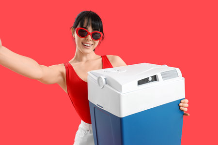 Young woman with portable refrigerator taking selfie on red background