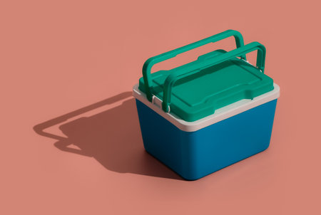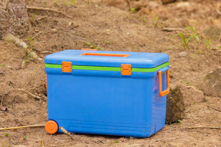 Closed blue plastic cool box on orange background. Space for text