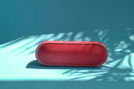 Mini red speaker isolated on blue background with shadows. Copy space.