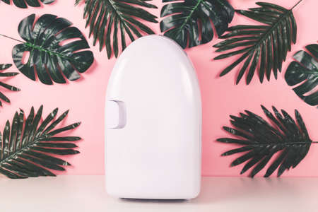 Mini fridge on pink background. Minimal composition.