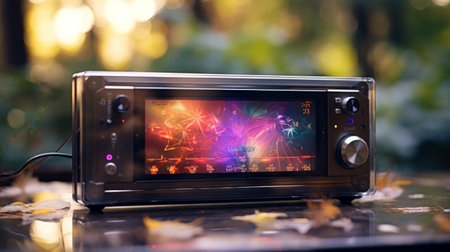 The rhythm of the music becomes visible on this modern bluetooth speaker. A dynamic display of fiery colors and abstract light patterns glows intensely, reflecting on a wet surface under the soft bokeh of night lights, symbolizing powerful sound and portable entertainment.