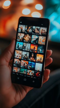 A smartphone displaying multiple movie thumbnails, illustrating the digital entertainment and streaming era.