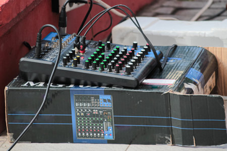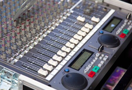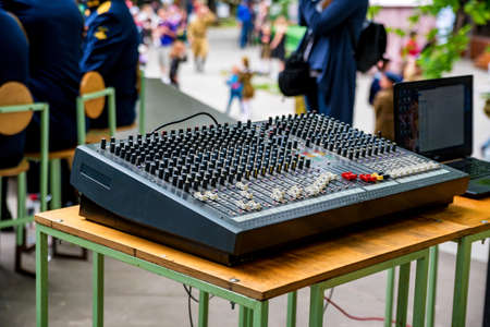 Music equipment closeup. Management console sound design at the event. Big black mixer with control knobs.