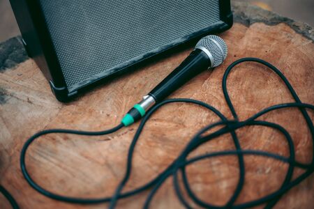 Outdoor music center with large speakers. Music equipment of a street musician. Ukraine, Nikolaev - 02 19 2022