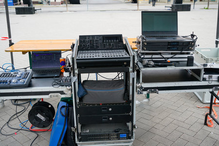 Professional audio mixing console with laptop set, outdoor event. Sound engineer adjusting settings for live performance, high-quality audio output. Sound mixer for music control, performance setup
