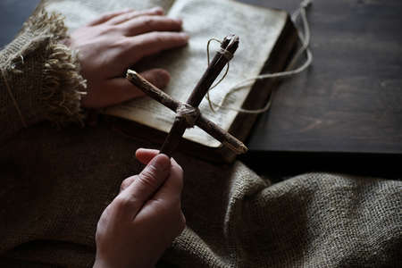 a wooden cross in woman hands. woman hand with Bible praying.