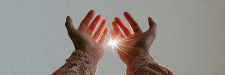 Two hands stretch out toward a radiant light, symbolizing aspiration and tranquility in a calm atmosphere, encouraging a sense of peace and inspiration.