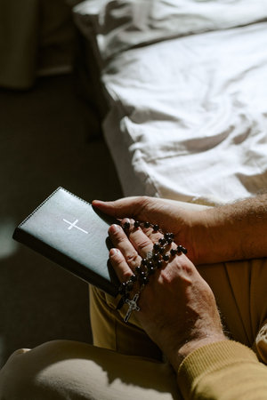 Caucasian middle aged man sitting on bed holding closed Bible and rosary beads in hands, fingers gently resting on book, sunlight illuminating hands and religious objects
