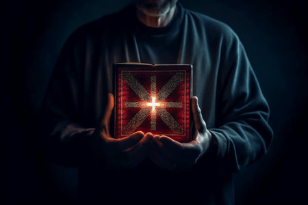 Open hand with glowing light above the Holy Bible, symbolizing prayer, blessing, faith, Christianity, divine hope and spiritual strength from God Word and holy guidance.