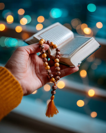 A hand holding gently wooden tasbih beads in front of an open Quran with glowing bokeh lights in the background, symbolizing spiritual devotion and peaceful reflection.