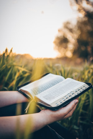 Christian teenage girl holds bible in her hands. Reading the Holy Bible in a field during beautiful sunset. Concept for faith, spirituality and religion. Peace, hope