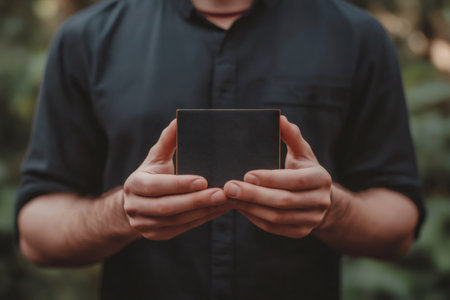 Close up of a man showing a black wallet mockup with both hands, perfect for showcasing your design