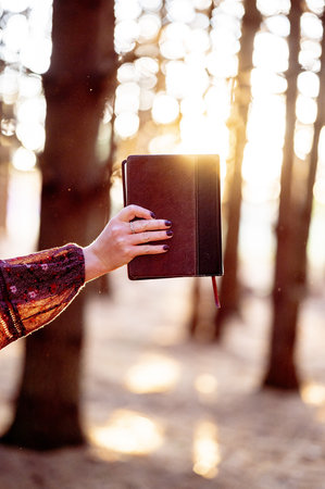 A vertical selective focus shot of a female hand holding a journal