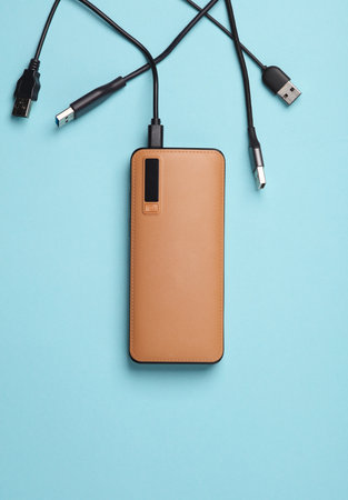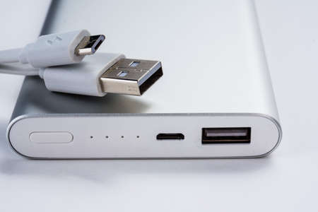 Modern technology power bank. Wired external portable battery for charge cell phone, smartphone and other devices isolated on abstract blurred white background. Urban and travelling lifestyle concept
