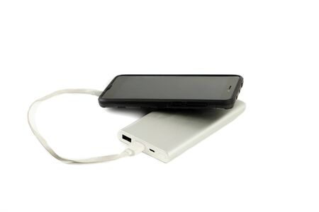 Power bank for charging mobile devices on a white background. Smartphone charger with power supply. External battery for mobile devices.