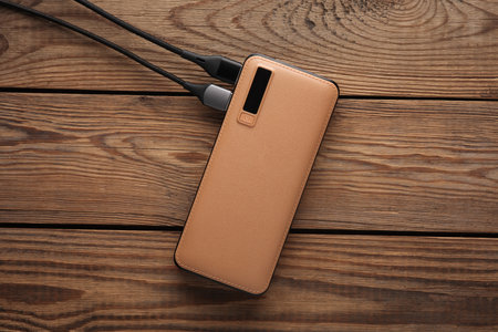 The smartphone is charging from external powerbank with cable on a brown wooden background. Top view