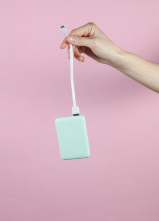 USB connector is connected to Power bank on a pink background. Charging gadgets. Close-up, selective focus