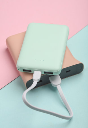 External portable battery (power bank) on blue-pink pastel background. top view. flat lay