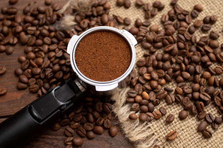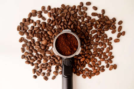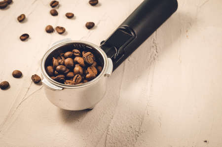 coffee machine horn, with ground coffee inside, against a background of coffee beans