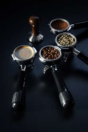 Tamper and four espresso filter holders filled with green, roasted, ground beans and ready-made espresso coffee on a black table. Concept. With selective focus. Copy space