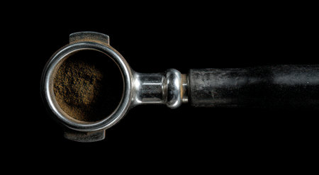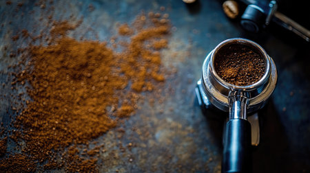 This image showcases a metal portafilter filled with ground coffee. The coffee grounds are scattered around the portafilter against a dark background, with a high-angle composition. The texture of the coffee and metal is highlighted. Suitable for use in a range of editorial and commercial applications.