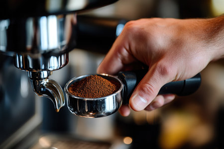 Close-up of a hand grasping a portafilter filled with freshly ground espresso coffee, capturing a moment of craft and anticipation before brewing.
