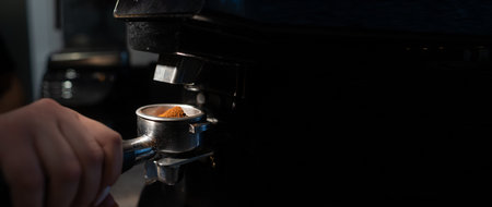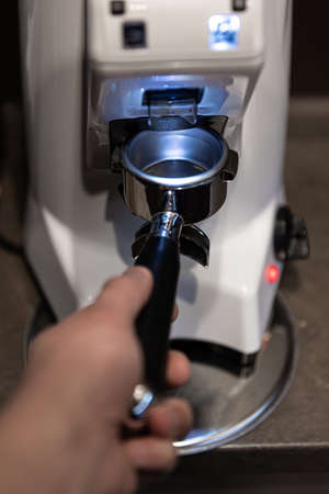 close-up of a barista holding a portafilter with coffee in front of an electric coffee grinder in a cafe. The concept of the process of preparing beans for making morning espresso in a coffee shop. Banner and place for text.