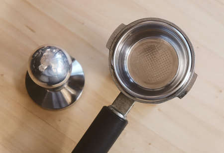 Coffee Time, Top View of Metal Portafilter and Tamper of Espresso Coffee Machine on Wooden Table.