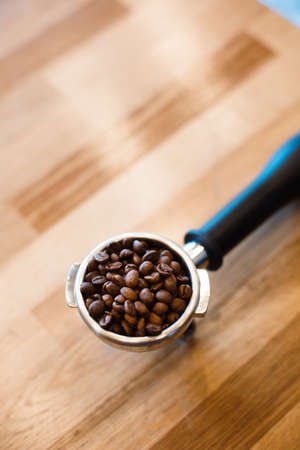 barista left a portafilter with beans.Assorted coffee beans in portafilter on brown wooden background. side view, copy space.