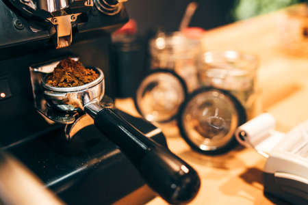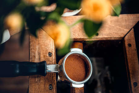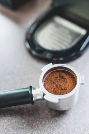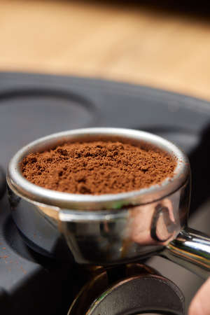 Close up Grounded espresso in a portafilter, coffee machine.