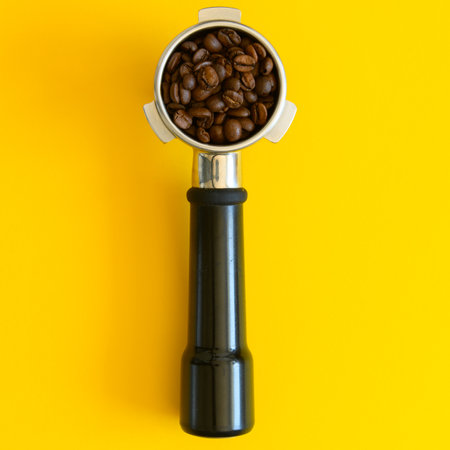 Espresso portafilter with whole coffee beans in the filter basket lying on a yellow background. The portafilter is lying vertically in the middle of the frame, close up.