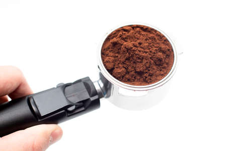 Barista hand holding a metal holder from the coffee machine with ground coffee inside