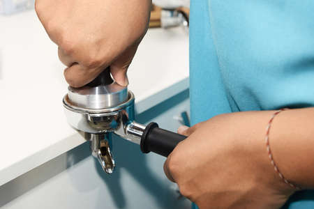 Close up of barista with tamper and piston or portafilter making espresso oa cappucino. Male barista tamping coffee in a portafilter in bright coffeeshop.