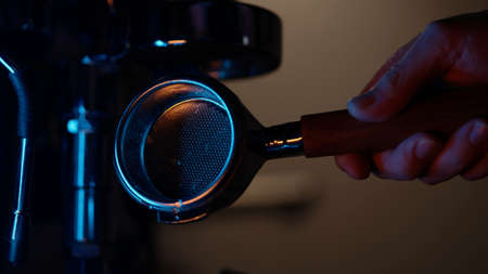 A man with a portafilter in his hands. The concept of making coffee in a coffee machine. Photo in a low key.