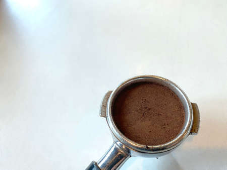 Arabica coffee powder and Robusta golden brown look fragrant in a Portafilter with copy space on white marble table. barista learning concept and information.