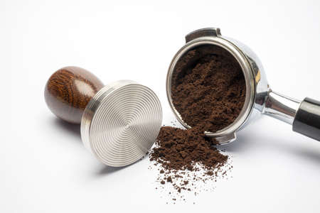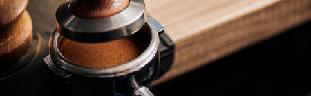 tamper near portafilter with grinded coffee, espresso, manual press, arabica, caffeine, banner
