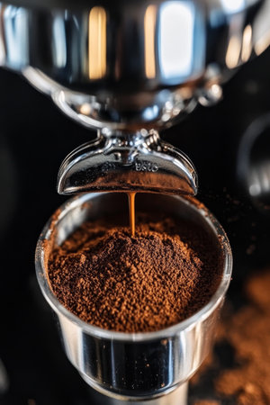 A portafilter brims with rich, dark brown coffee powder as an espresso machine crafts a perfect cup of aromatic black coffee.