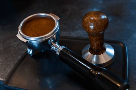 Closeup metal portafilter tamper for tempering, pressing ground coffee on table. Special tool kit for preparing, making espresso americano using professional machine in cafe. Hot drinks, beverages.