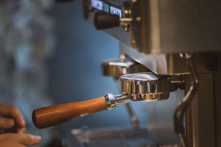 Barista holding coffee holder pressing coffee into holder for coffee machine, close up