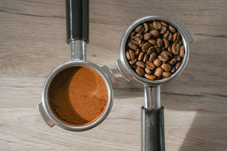 ground coffee is tempered in the holder, the coffee bean lies in the holder, on a wooden table, top view, the process of preparing a coffee drink