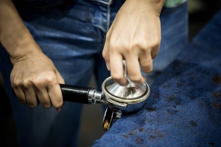 Barista working in a coffee shop, Close up of barista presses ground coffee using tamper, Barista Make Coffee Portafilter Concept