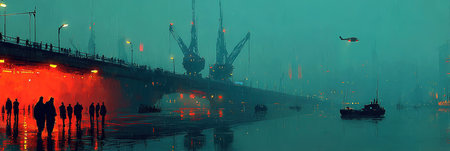 dockyard at night, with subtle lighting from ships and cranes. Generative AI