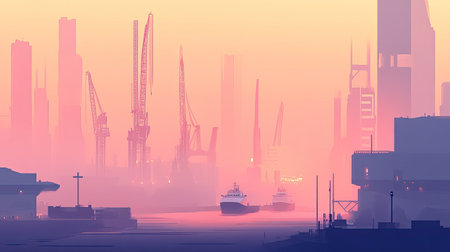 This moody harbor scene captures the silhouettes of cranes and cargo ships enveloped in fog at dawn, creating an atmospheric and tranquil setting.