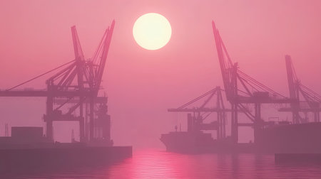 A stunning sunset paints the sky in soft pink hues, silhouetting industrial cranes and ships at a quiet harbor, evoking tranquility and beauty.