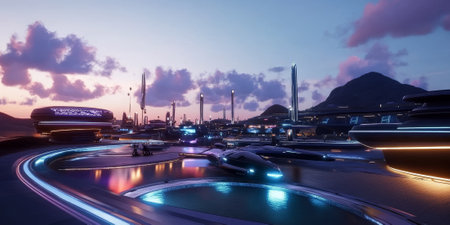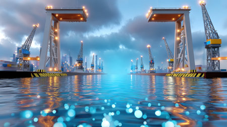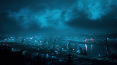 Bustling harbor bordered by twinkling lights from docked ships and cranes, Professional stock photo, AI generated photograph